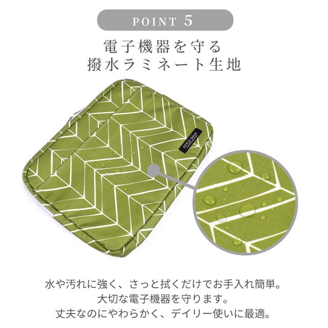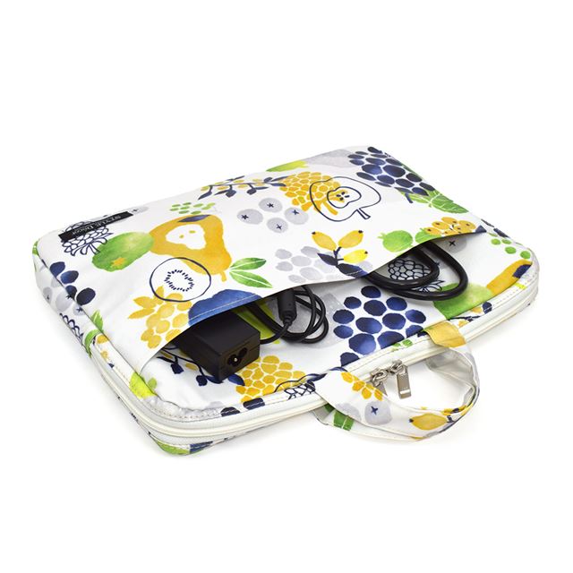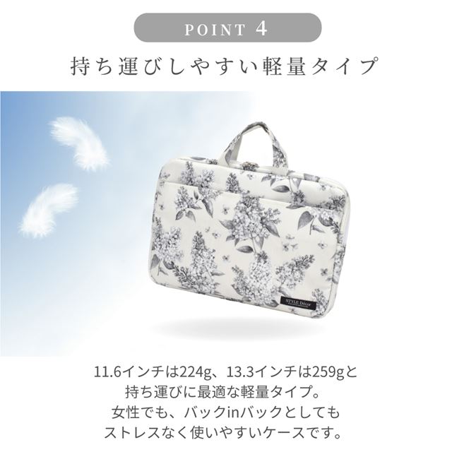 13.3インチのノートパソコンが収納可能。お手持ちのバッグにもスマートに収まるインナーケースです。内側には柔らかいクッション性のある素材を使用。適度なクッション性が、衝撃やほこり、キズなどから守ってくれます。大きく開く両開きファスナー仕様でパソコンの出し入れもスムーズ。前ポケットは扱いやすい面ファスナー仕様で、電源コードなどの周辺機器を入れることができます。内ポケットは、CD-RやUSBメモリなど紛失しやすいものの収納に最適。表面は水分に強いつや消しラミネート素材なので安心です。