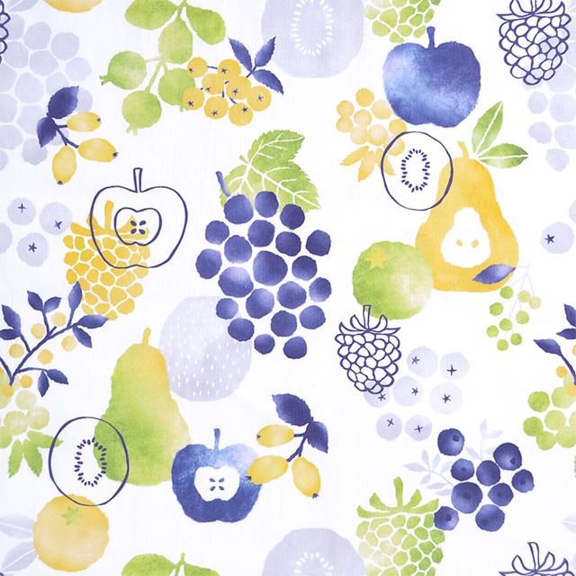 洋なしや林檎など、収穫期を迎えた丸みのある可愛いフルーツがたくさん描かれたポップなデザイン。水彩画タッチの優しさと、ブルー、グリーン、黄色の独特な色使いも魅力的です。